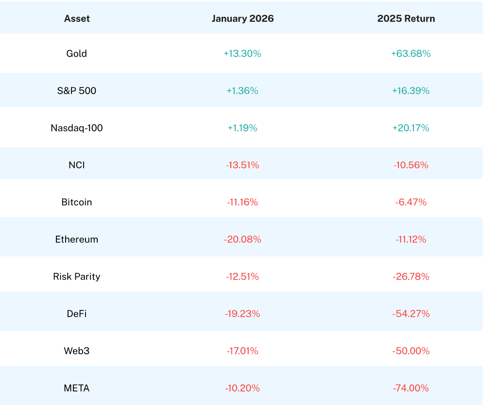 January opened the year with a stark reminder of crypto's evolving relationship with traditional safe havens. While gold surged 13.30%—its strongest January in decades—the Nasdaq CME CryptoTM Index (NCITM) declined 13.51%, extending 2025's losses into the new year.