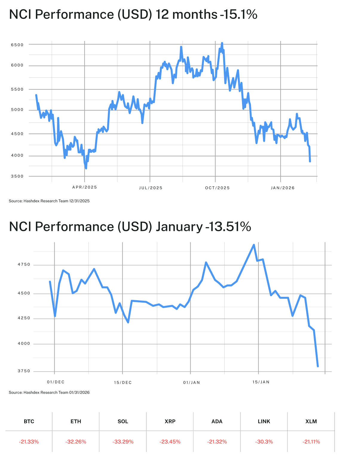 January will be remembered not for its modest losses but for the questions it raised about crypto's role in portfolios during periods of extreme uncertainty. Gold's dominance challenged convenient narratives, while regulatory and institutional infrastructure proved resilient despite price weakness. For investors with conviction in digital assets' long-term potential, the NCI's market cap-weighted methodology provided meaningful protection during a month when thematic bets suffered significantly worse outcomes.
